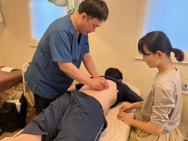 今回は、これまでに学んだ基本治療と、前回の症状の経過および治療結果を再診カルテに記入するところまでを受講生同士で行いました。