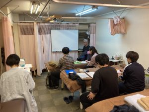 取穴方法や三稜鍼の刃の向きなどの注意事項の説明後、ビデオで一連の流れを把握してデモを行い、お互いの実技に入ってもらいました。