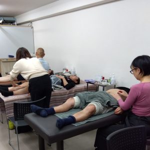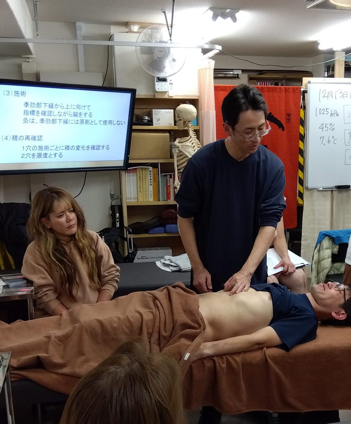 授業を行ったあと、実技デモで取穴方法を確認し、受講生同士でペアになり、主訴の確認から基本治療と補助治療、カルテ記入まで行いました。
